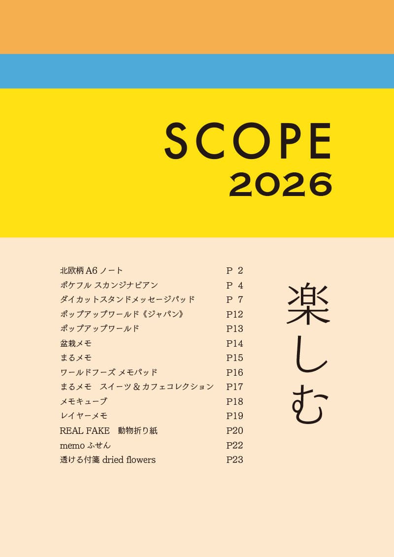 SCOPE 2026 商品カタログの画像をクリックしていただきますとPDFカタログをご覧いただけます。印刷されたカタログの郵送をご希望の場合はお問い合わせページよりご連絡ください。電話、メールでもご依頼いただけます。